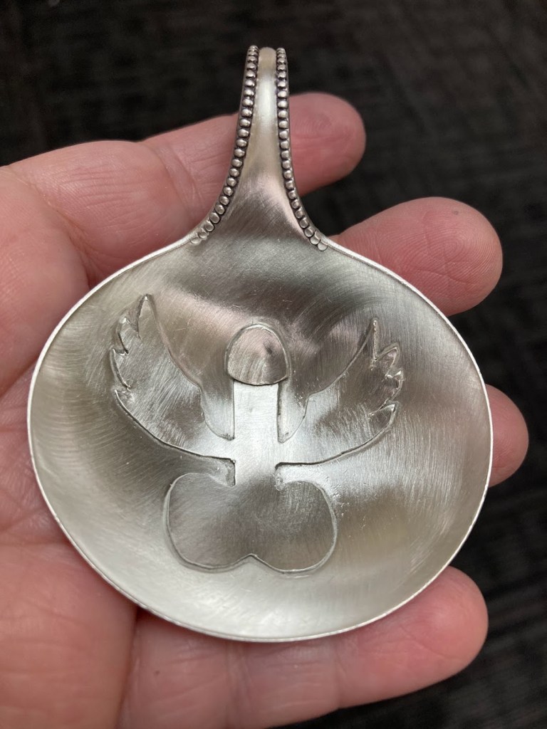 Some of my friends in the SCA are brewers, or hang out with brewers who throw parties. SCA culture includes wearing large medallions to show off your awards and individual heraldry. I combined these two ideas to create tasting cups in sterling silver, with personalized imagery.