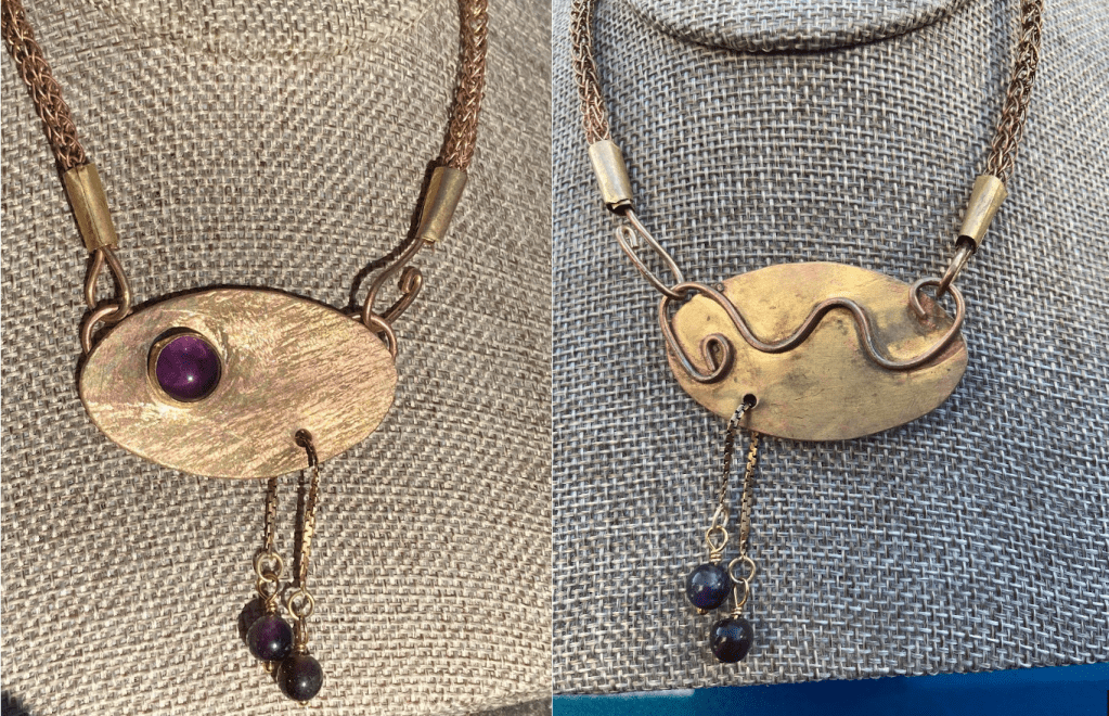 The brass necklace provides a unique texture on the front, the round amethyst to touch, amethyst beads on a chain that can be pulled back and forth, and a satisfying squiggle to trace on the back. And of course I handmade the chain, which has its own wonderful feel to it. $150.