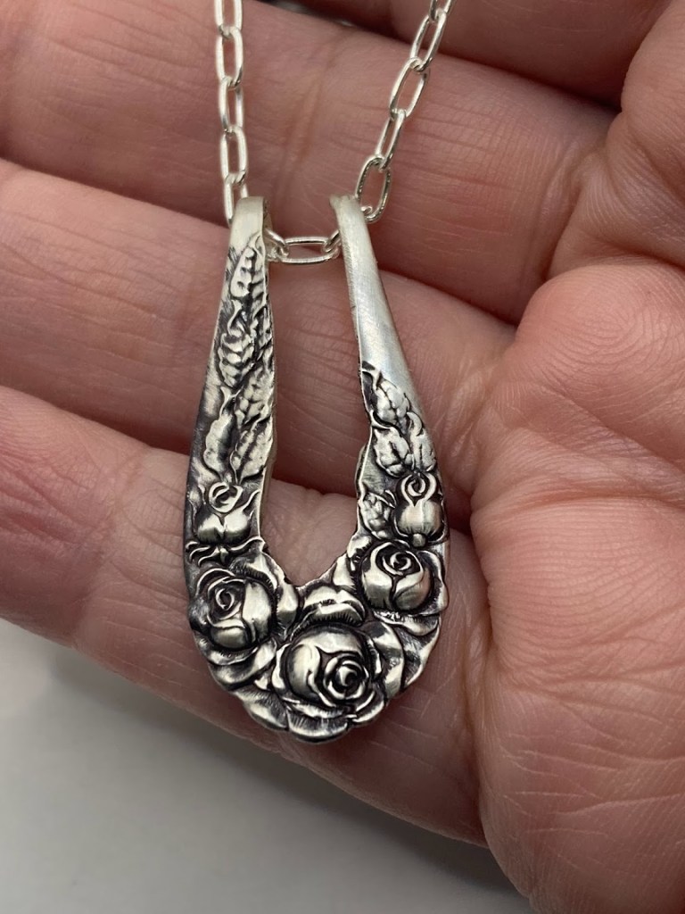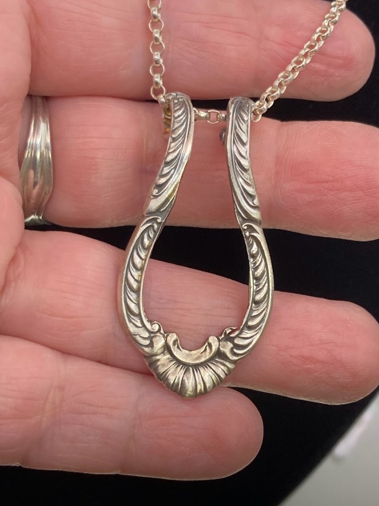Imagine you want to take your rings off for a bit – to wash dishes, to garden, to give a massage – and hang them on your necklace. These let you do that without unclasping the chain! Video here (please note I’m trying to move away from Etsy, but I do have a variety in stock). Most are made from vintage / antique sterling silver flatware. $40-130.
