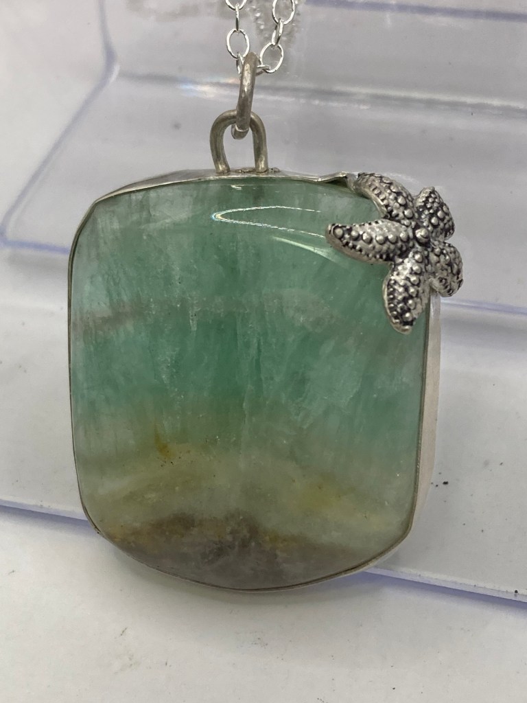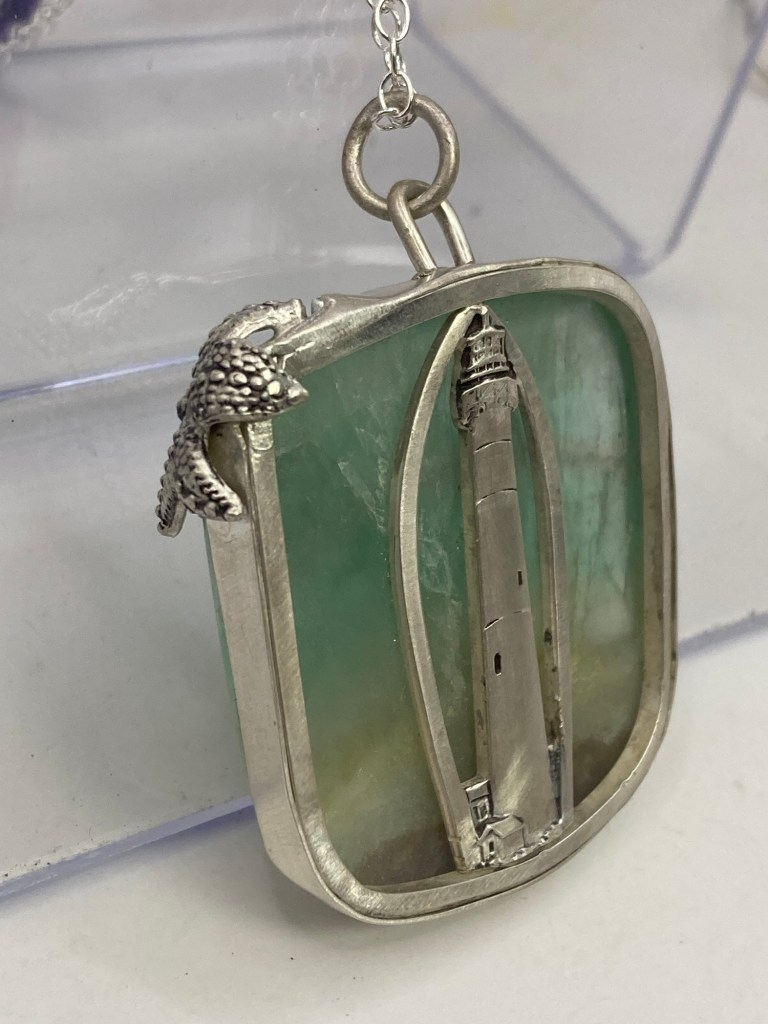 There’s a lighthouse on the back! I did the lapidary work on the stone, too! $300 Fluorite and sterling silver.