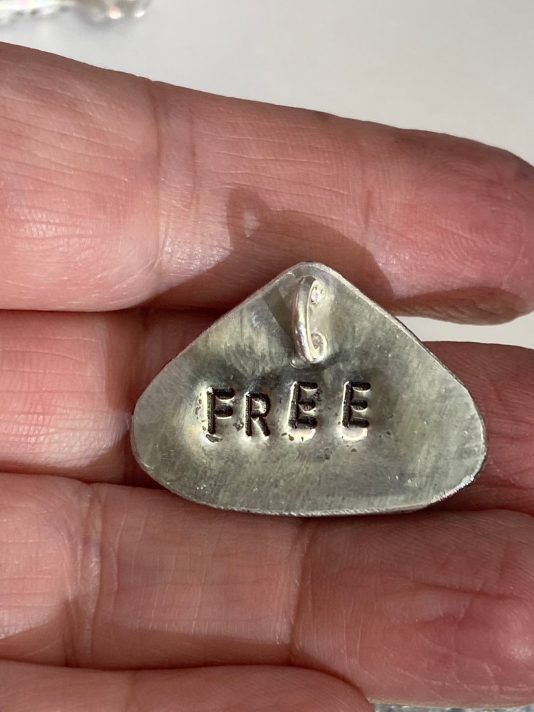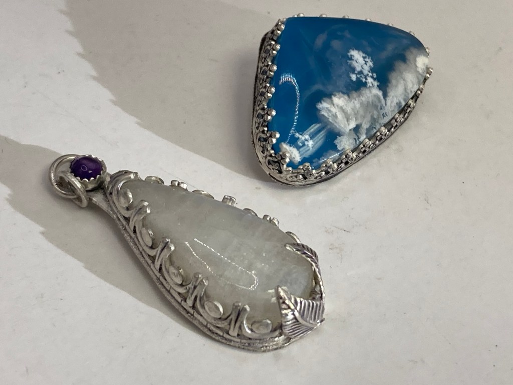 $130 each. Moonstone & amethyst, and snow agate, in silver. The snow agate is clear with white inclusions (similar to moss agate) and backed with blue acrylic to create a sky with happy puffy clouds.