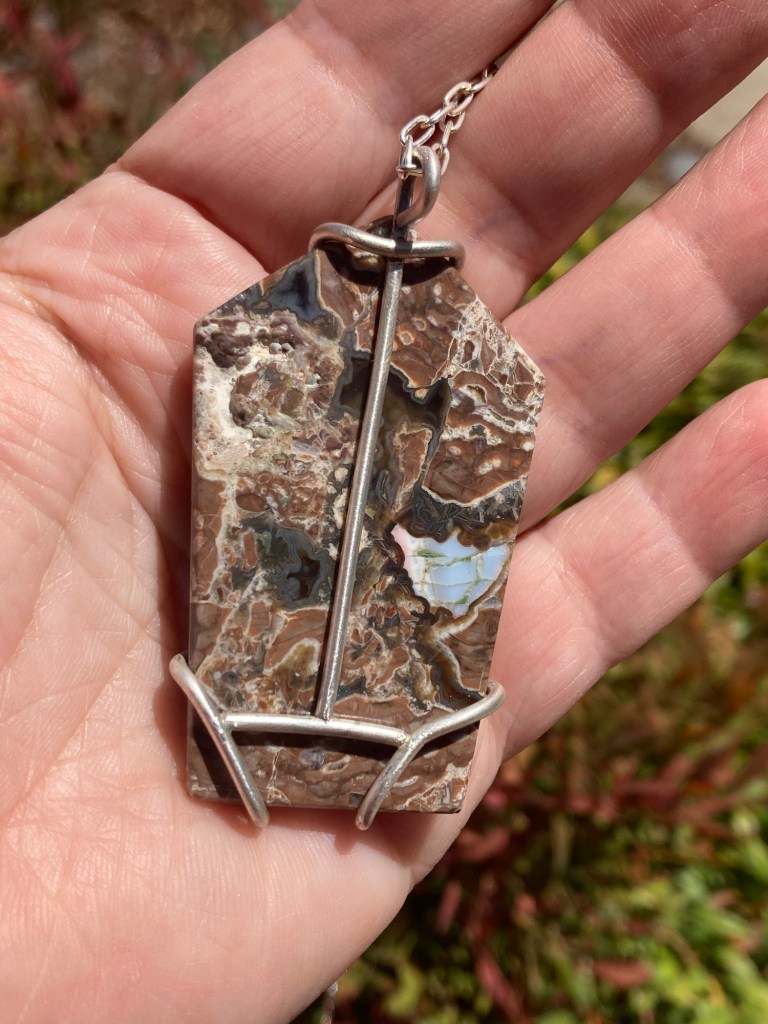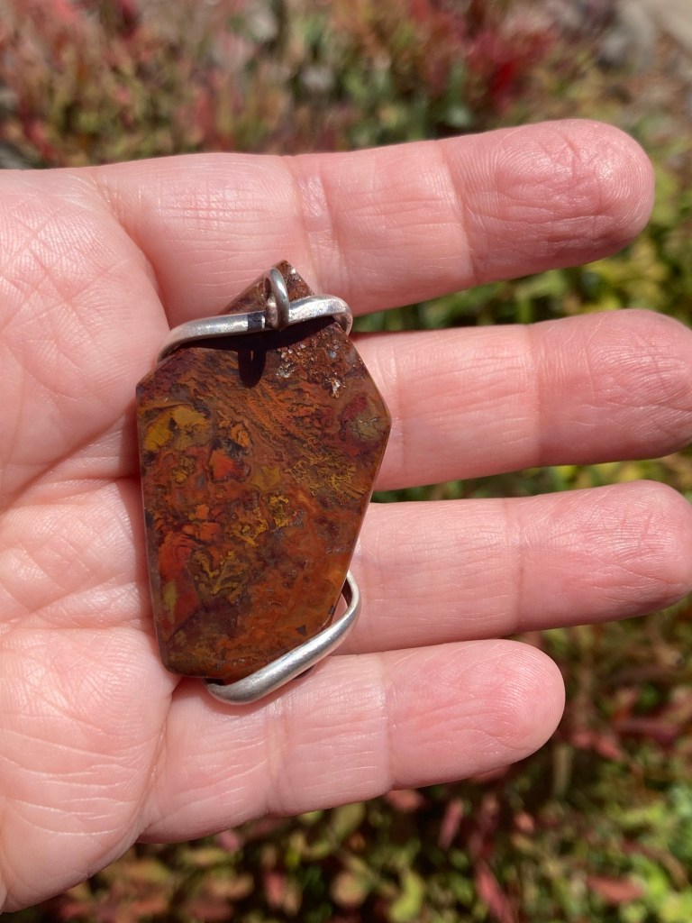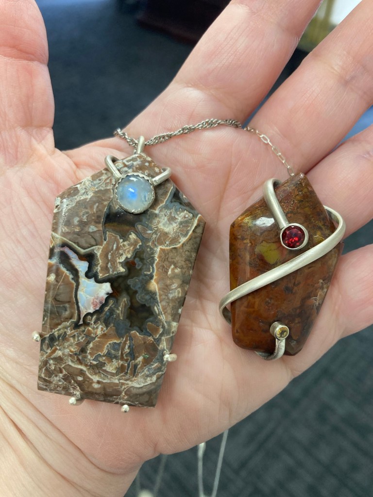 The first one has an opal inclusion, and I set that off with a little fiery moonstone. The second one got a spiral wrap with faceted garnet and citrine.