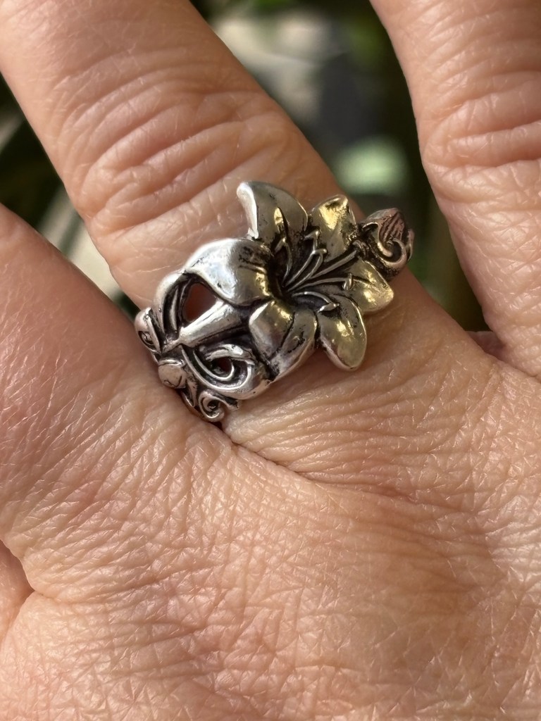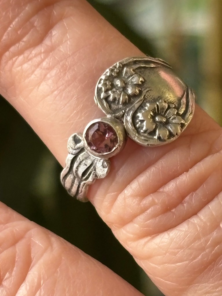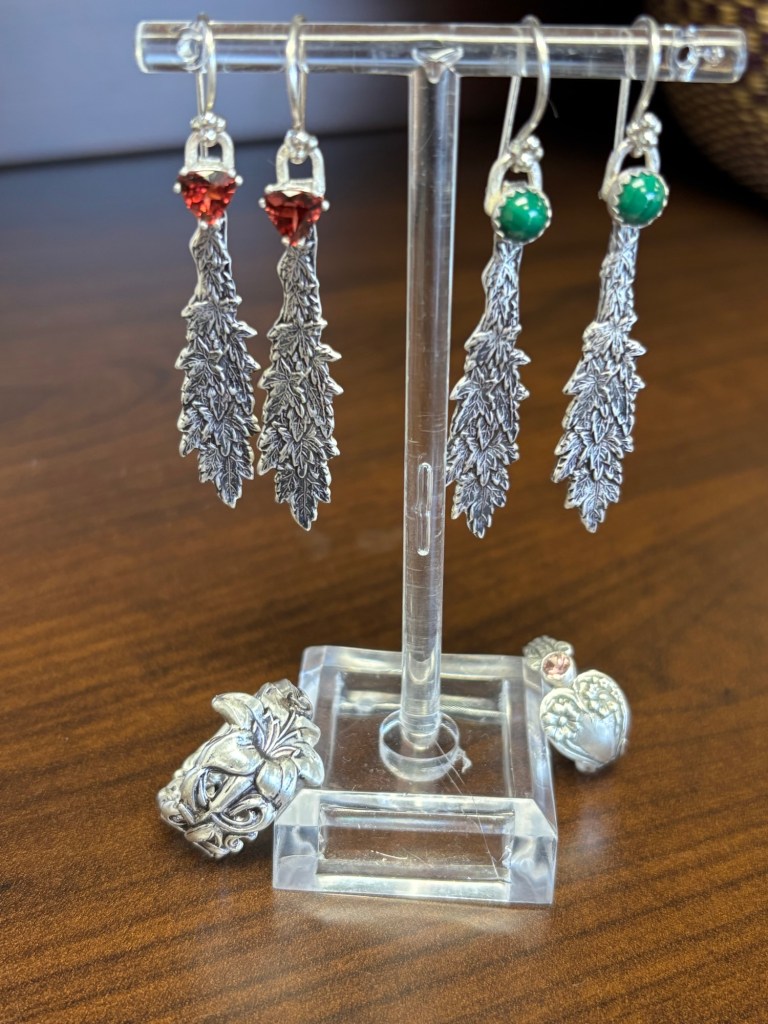 Maple leaf earrings in two flavors: Faceted garnet and cabochon malachite. Two rings, one lily and one with a pink tourmaline. All sterling silver, of course.