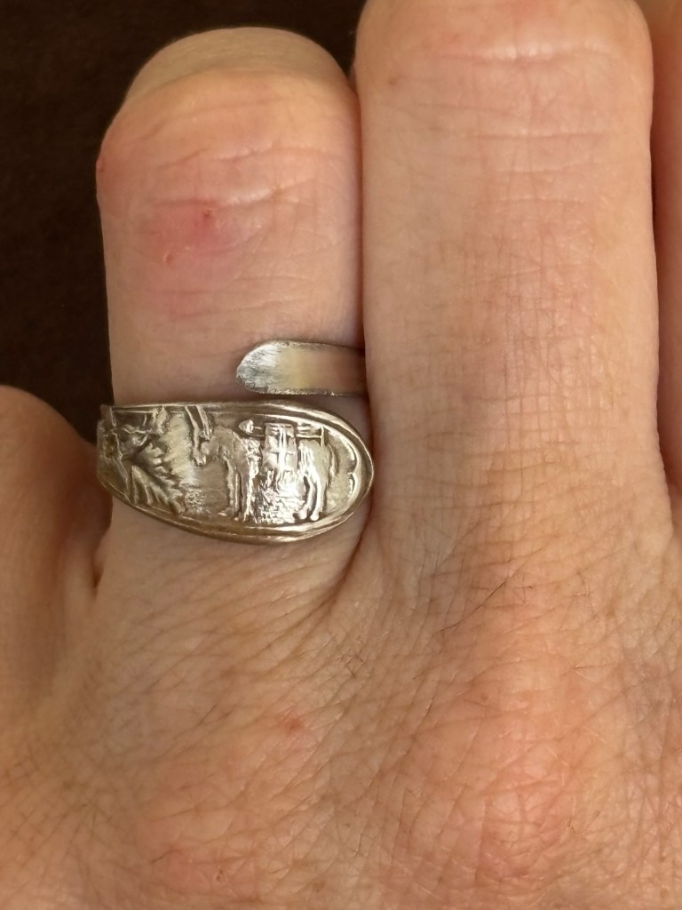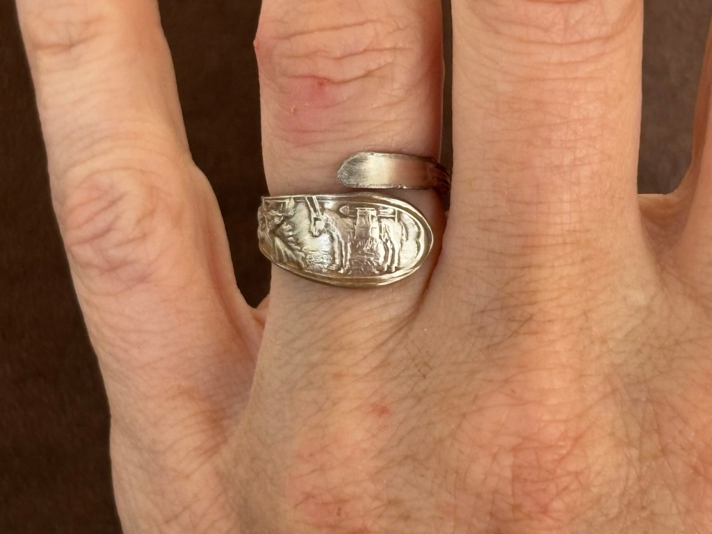 Kate has a farm stocked with chickens, goats, a livestock guardian dog, cats, and a curly pony, who was a free ranging mustang until she was captured by the Bureau of Land Management. This absolutely wild creature, who had zero exposure to humans except for her helicopter roundup, branding, and corral containment, has been utterly won over by Kate. No surprise to me… she’s a Disney Princess type in that animals instantly love and trust her. She’s very UN-princessy in that she wears farm clothes and rejects makeup and jewelry. I was so excited that she wanted this! I saw a sales listing for a souvenir spoon with a tiny burro on it and sent her a pic (Kate adores mules, donkeys, and burros). She immediately asked me to make her a ring. She chose an open wrap style instead of a soldered ring in case it gets caught on something – as you can see, her hands work hard. I love her so much.