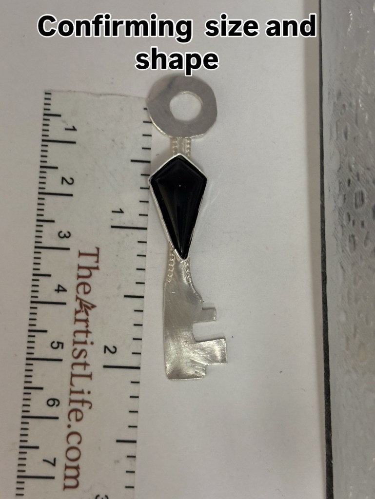 This piece incorporates a key motif with a jet stone. I made the bail large because it’s going onto his 3mm chain. Below are some progress pics.
