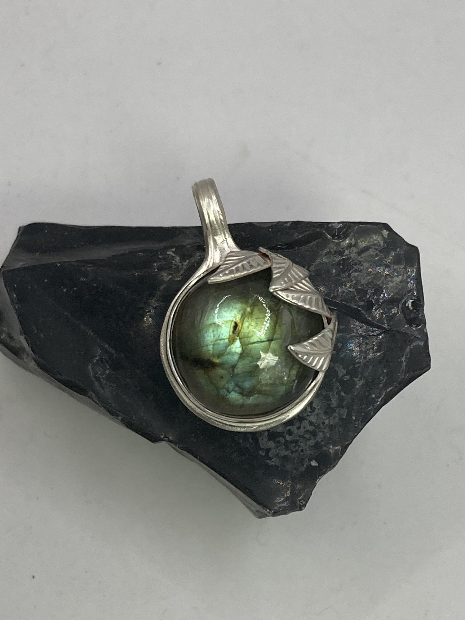 $130 each. Moonstone & amethyst, and snow agate, in silver. The snow agate is clear with white inclusions (similar to moss agate) and backed with blue acrylic to create a sky with happy puffy clouds.