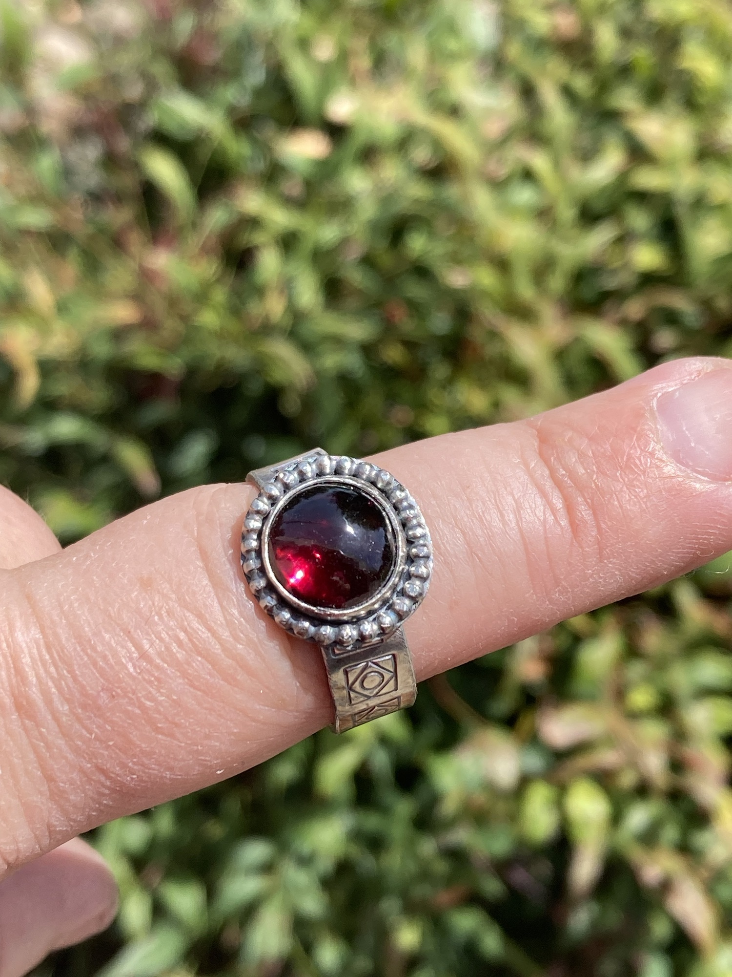 Garnet & silver, hand stamped shank. ❤️