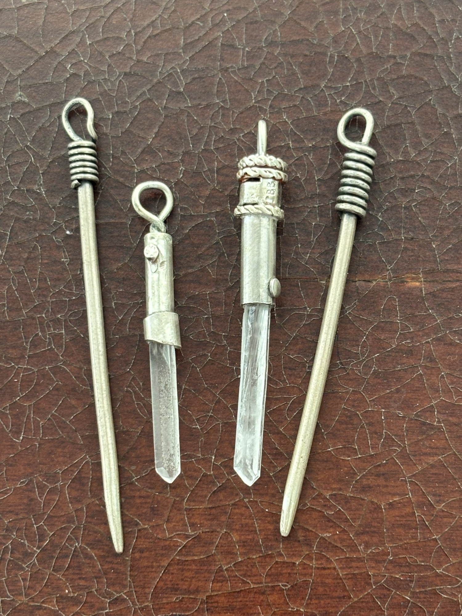 Sterling silver and quartz crystals, with tiny “on” buttons. The larger one swivels! Okay, so I originally made the all-silver ones as acupuncture needle pendants, but they are great for the more cost-conscious Jedi.