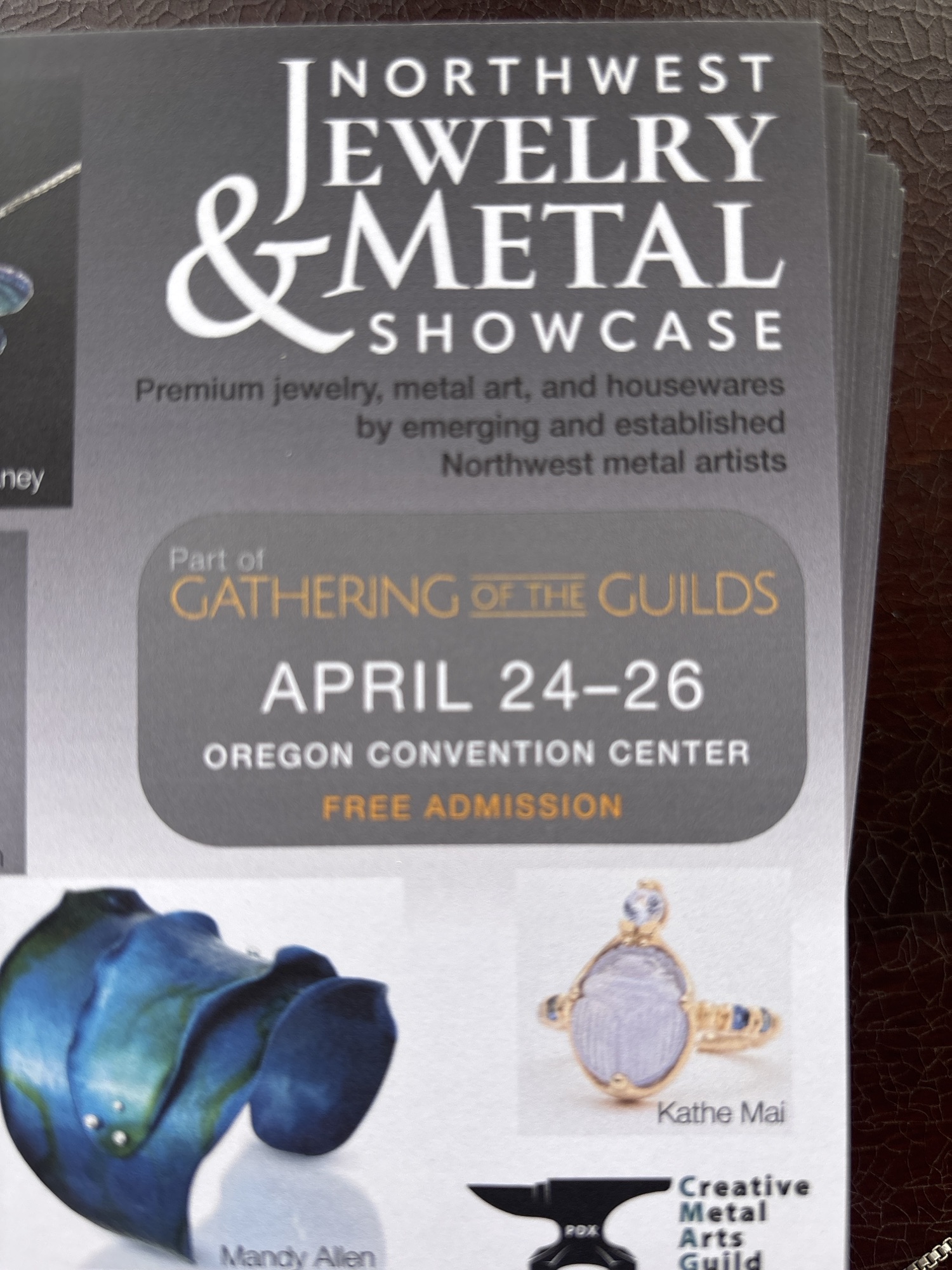 35th annual show by CMAG – the Creative Metal Arts Guild – and a number of others. Glass, pottery, woodworking, beads, printing, sculpture, gem faceting…. It’s an amazing show that I shopped at for years before joining the guild. And admission is 100% free! April 24-26 at the Oregon convention center.